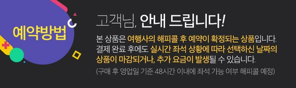 • 구매 후 확정 안내 : 본 상품은 해피콜을 통해 예약이 확정되는 상품이므로, 결제 완료 후에도 실시간 항공 상황에 따라선택하신 날짜가 좌석마감 혹은 추가요금 발생 될 수 있는 점 알려드립니다.