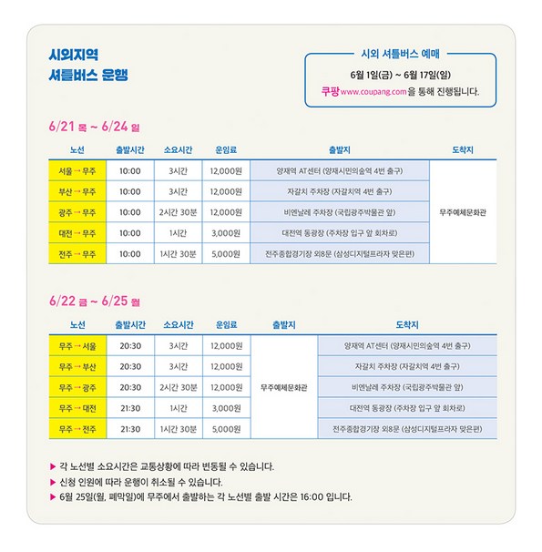 [요금안내] - 서울노선 : 12,000원 - 부산노선 : 12,000원 - 광주노선 : 12,000원 - 대전노선 : 3,000원 - 전주노선 : 5,000원 - 대/소인 요금 동일 - 딜이 종료된 후 , 6월 18일(월)에 출발 확정 문자를 보내드립니다. - 안내 문자를 받으실 핸드폰 번호를 쿠팡 구매 시 다시 한 번 확인하시기 바랍니다. - 여행자보험 가입을 원하실 경우 별도로 개별가입을 하시기 바랍니다.